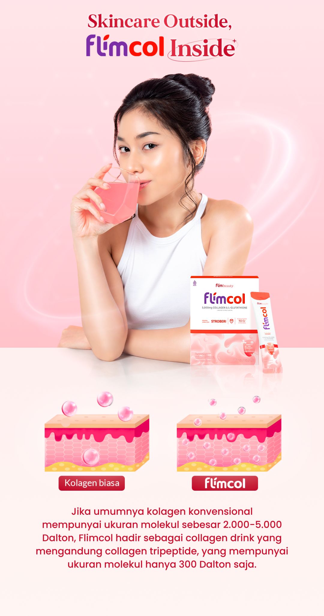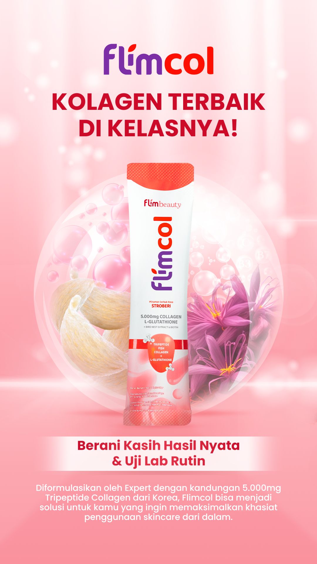 - Flimcol akan meningkatkan kadar kolagen sehingga dapat menjaga kondisi dan kesehatan kulit kamu