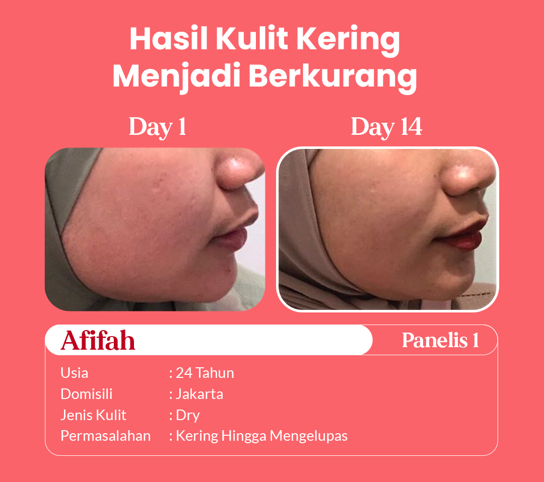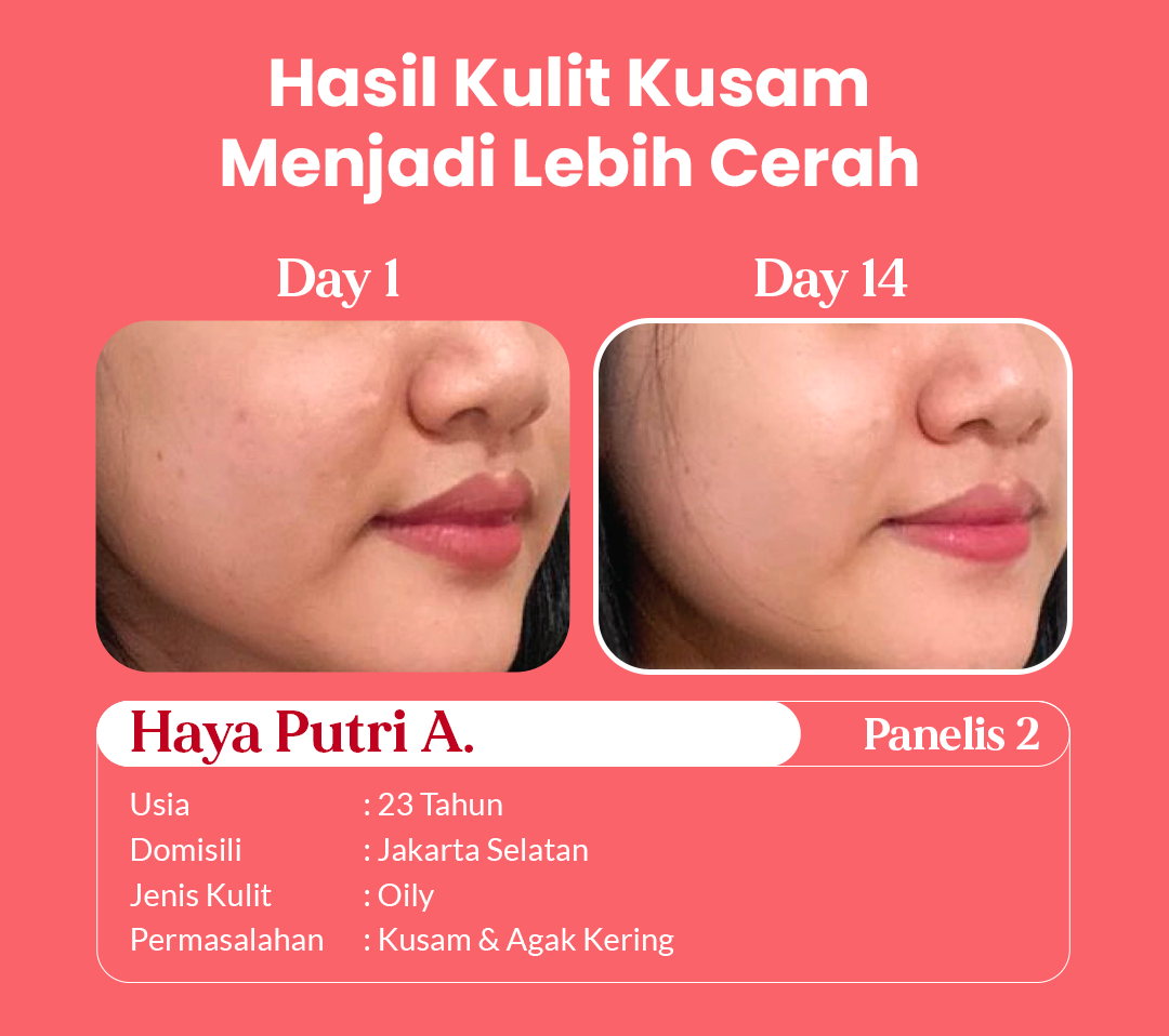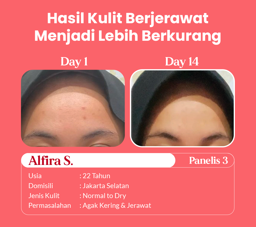 dengan kondisi kulit wajah yang berbeda-beda. Melalui pemakaian rutin selama 14 hari, hasil menunjukkan bahwa kulit menjadi lebih lembap, cerah, dan bekas jerawat memudar.